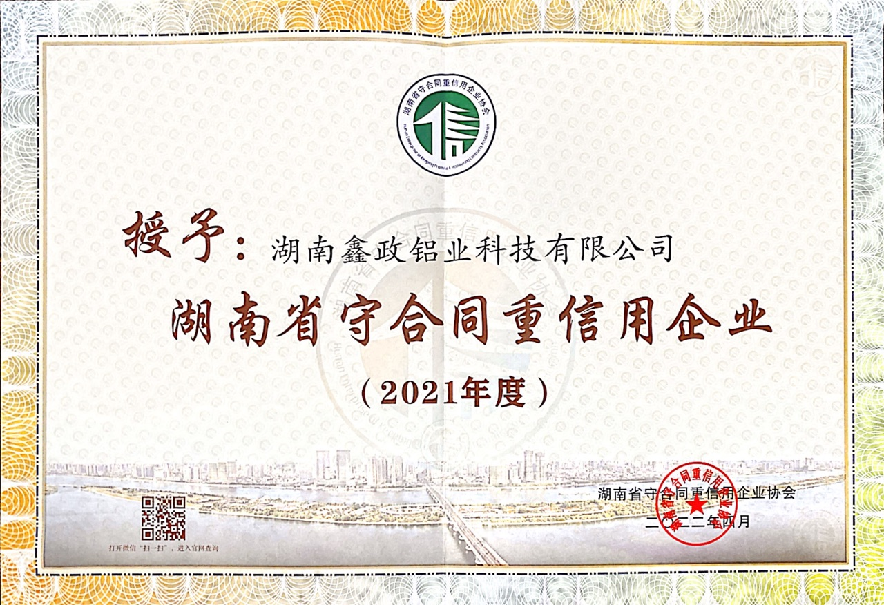 瀏覽次數:1602近日,2021年度湖南省“守合同重信用企業”名單公布,湖南鑫政鋁業科技有限公司榮膺湖南省“守合同重信用企業”稱號。
