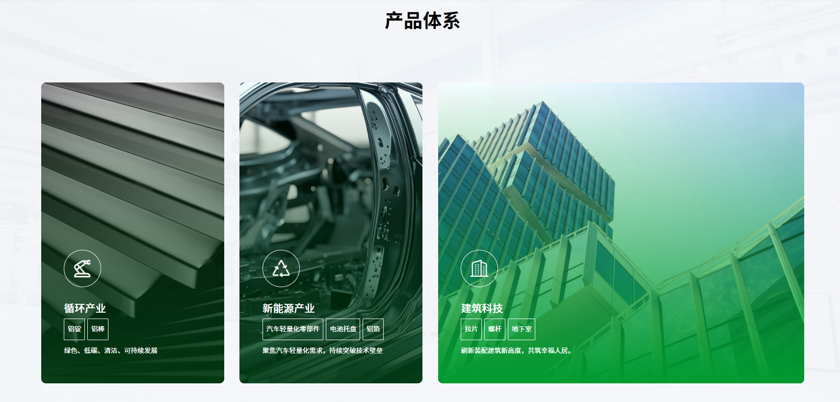 官網(wǎng)系統(tǒng)性重構產品展示體系,清晰呈現(xiàn)循環(huán)產業(yè)、新能源產業(yè)、建筑科技三大核心業(yè)務版圖,以精煉內容與層次化視覺設計,突顯鑫政從建筑科技向新能源材料領域的戰(zhàn)略延伸。