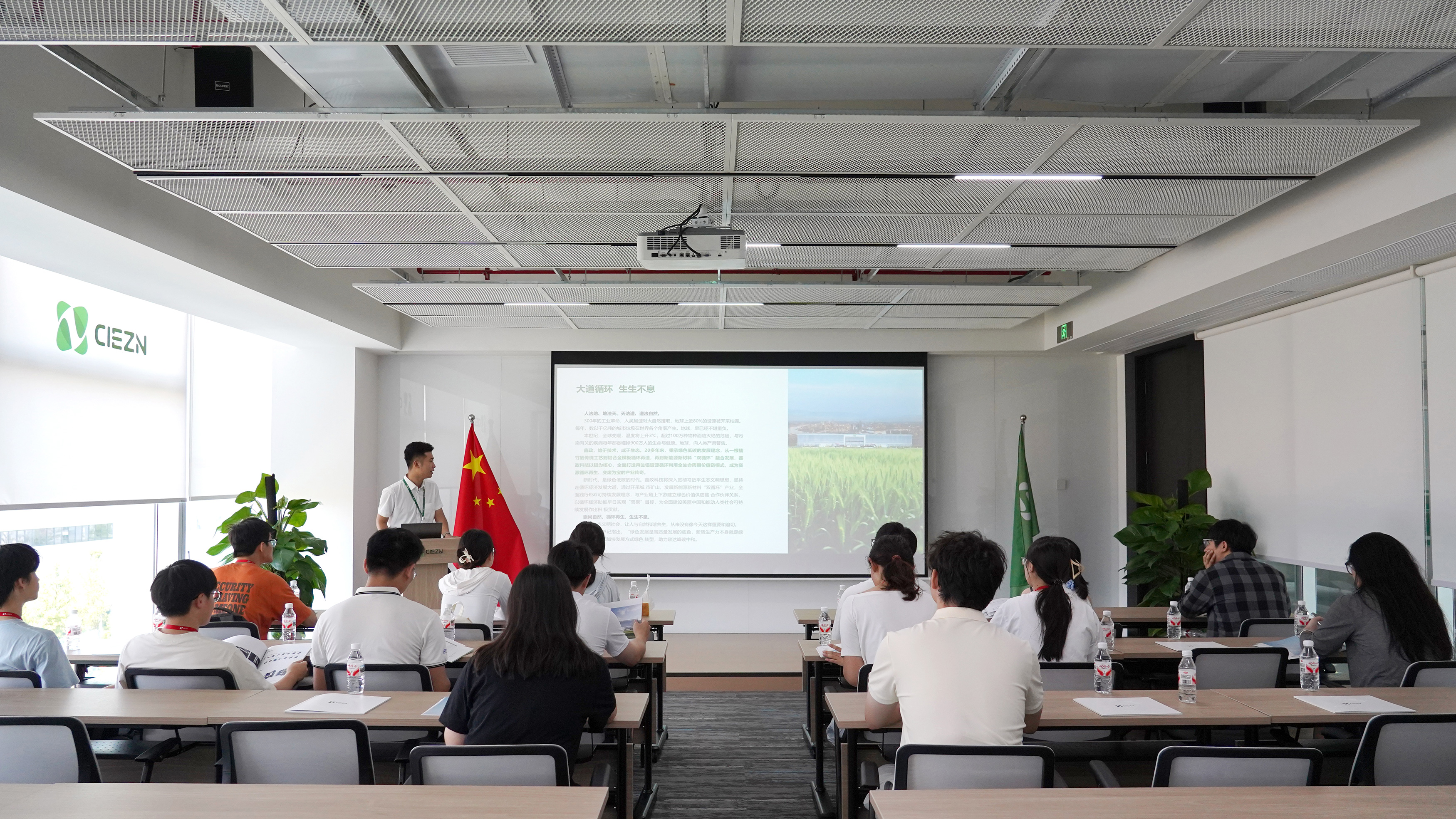 在數字展廳,學子們通過系統講解,深入了解鑫政的發展戰略、業務布局及技術創新實力。實地探訪花園式智慧園區,深入現代化數字車間一線。在這里,標準化的高效運營流程與前沿技術成果的規?;瘧脠鼍吧鷦映尸F,使課堂知識在真實的產業環境中獲得具象化詮釋。